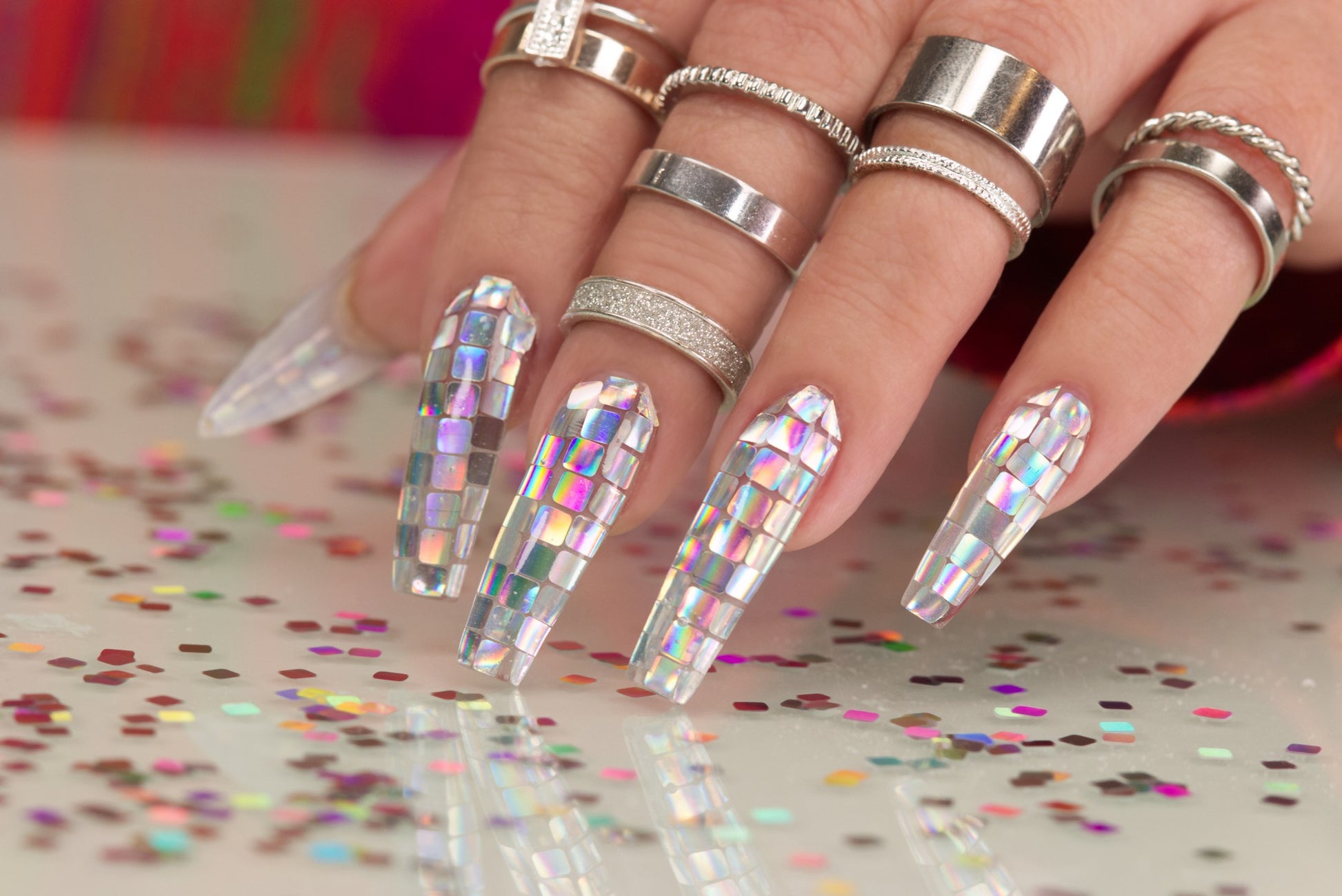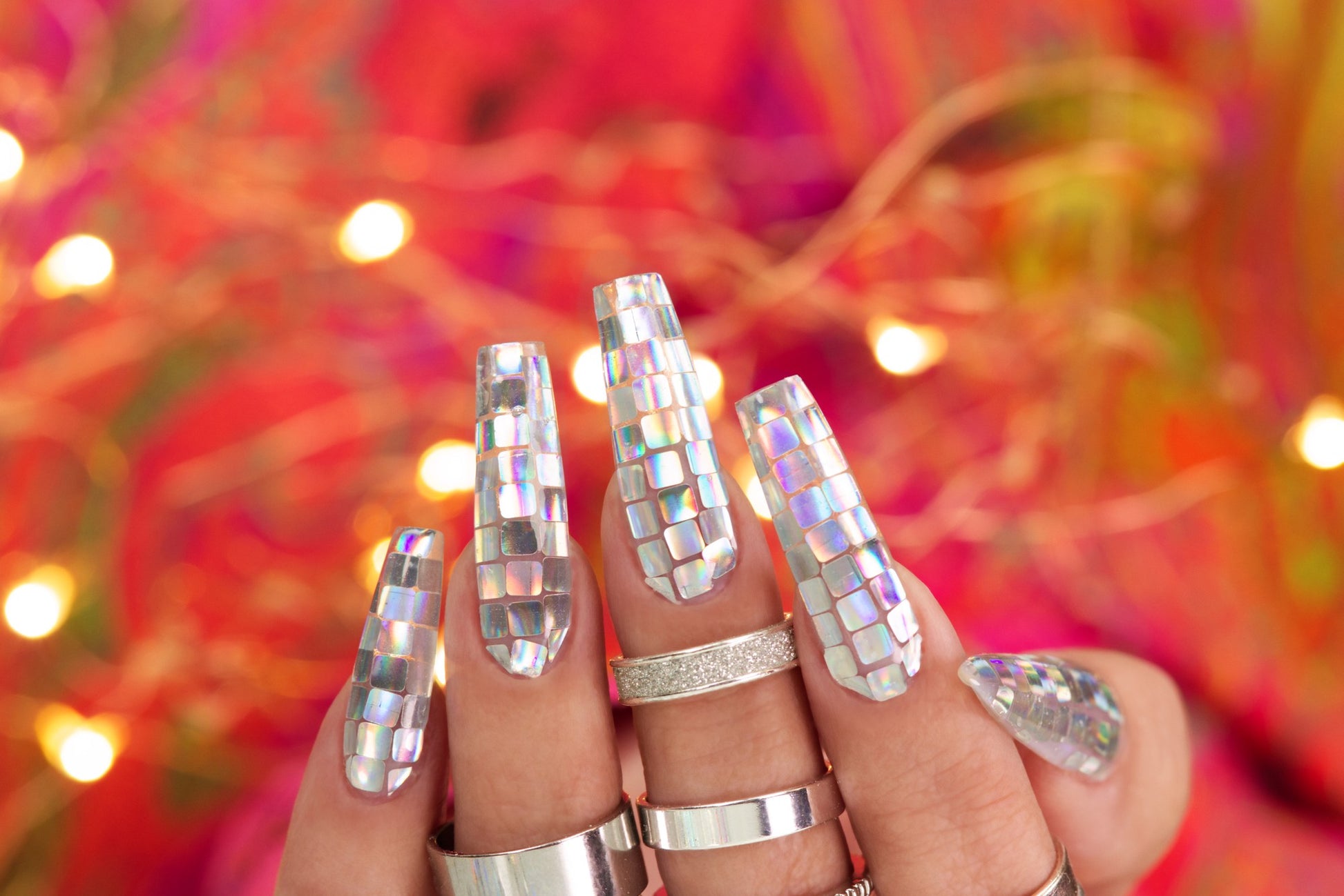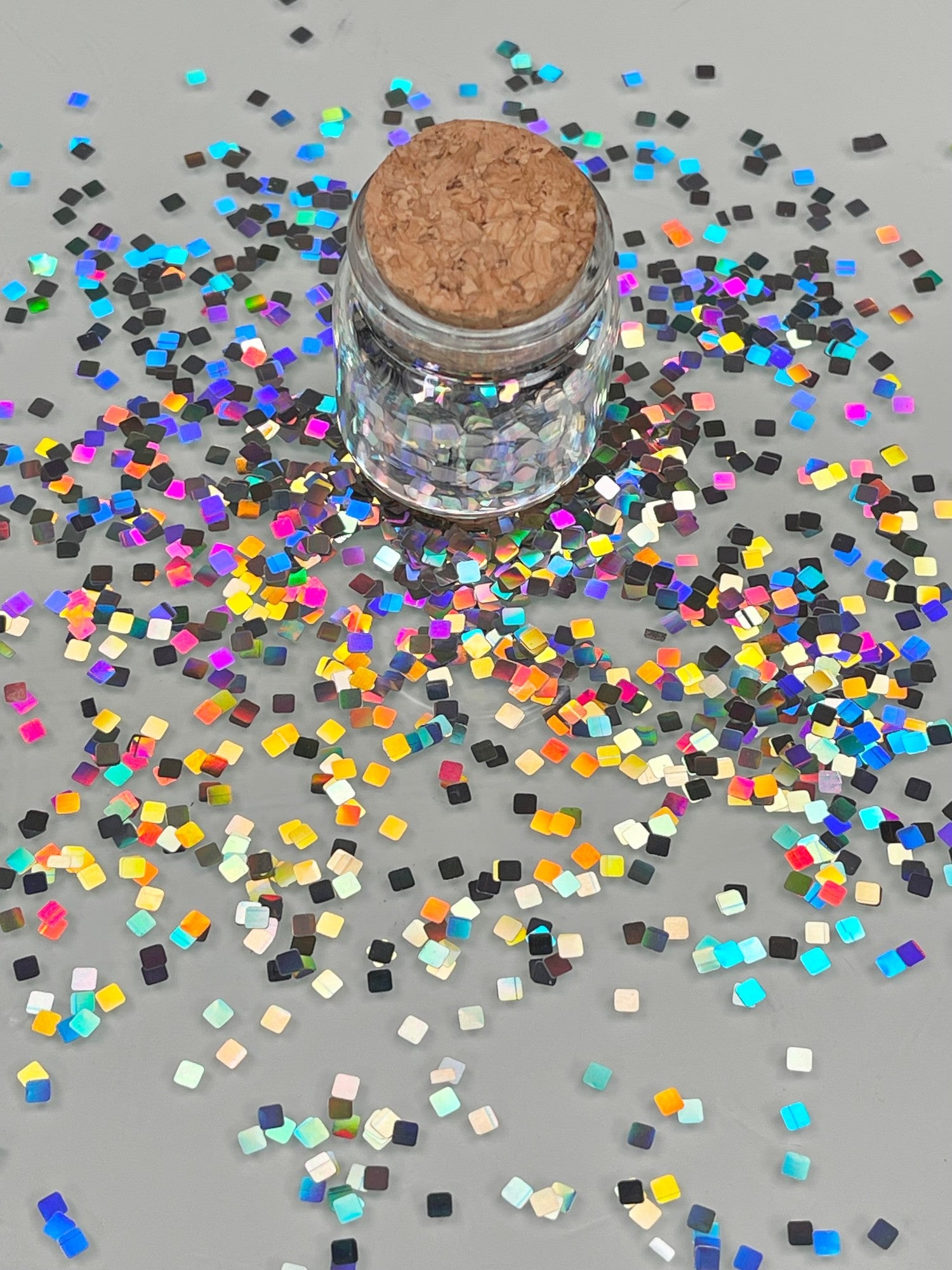 Small Silver Squares that a super reflective. When you move them you can see the multicolours.