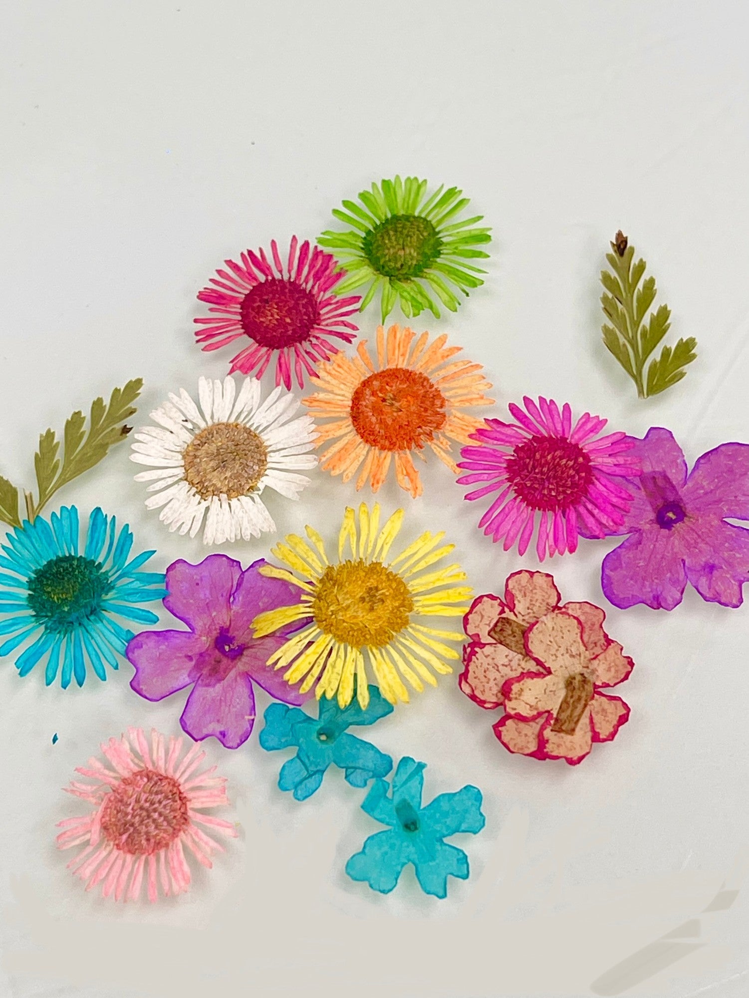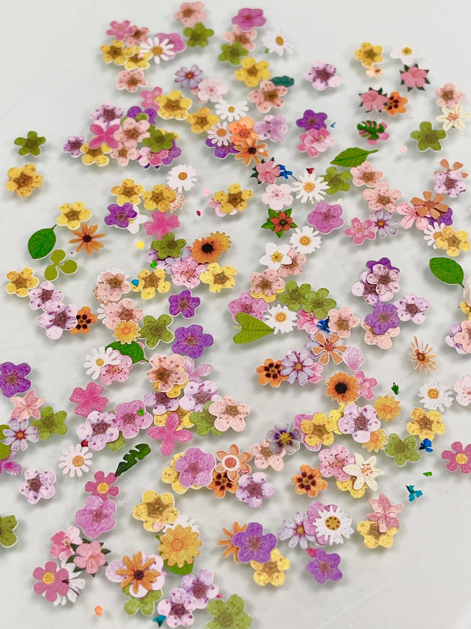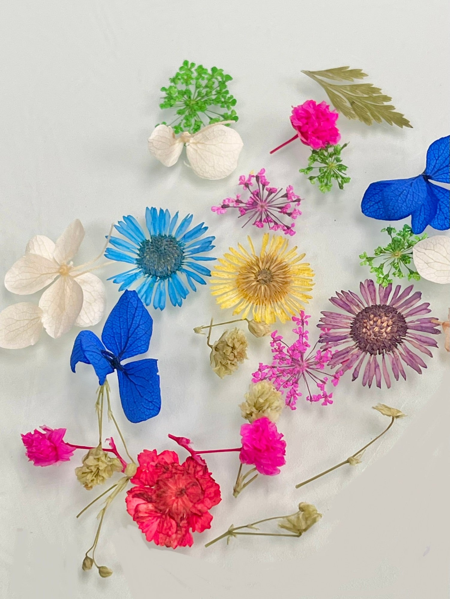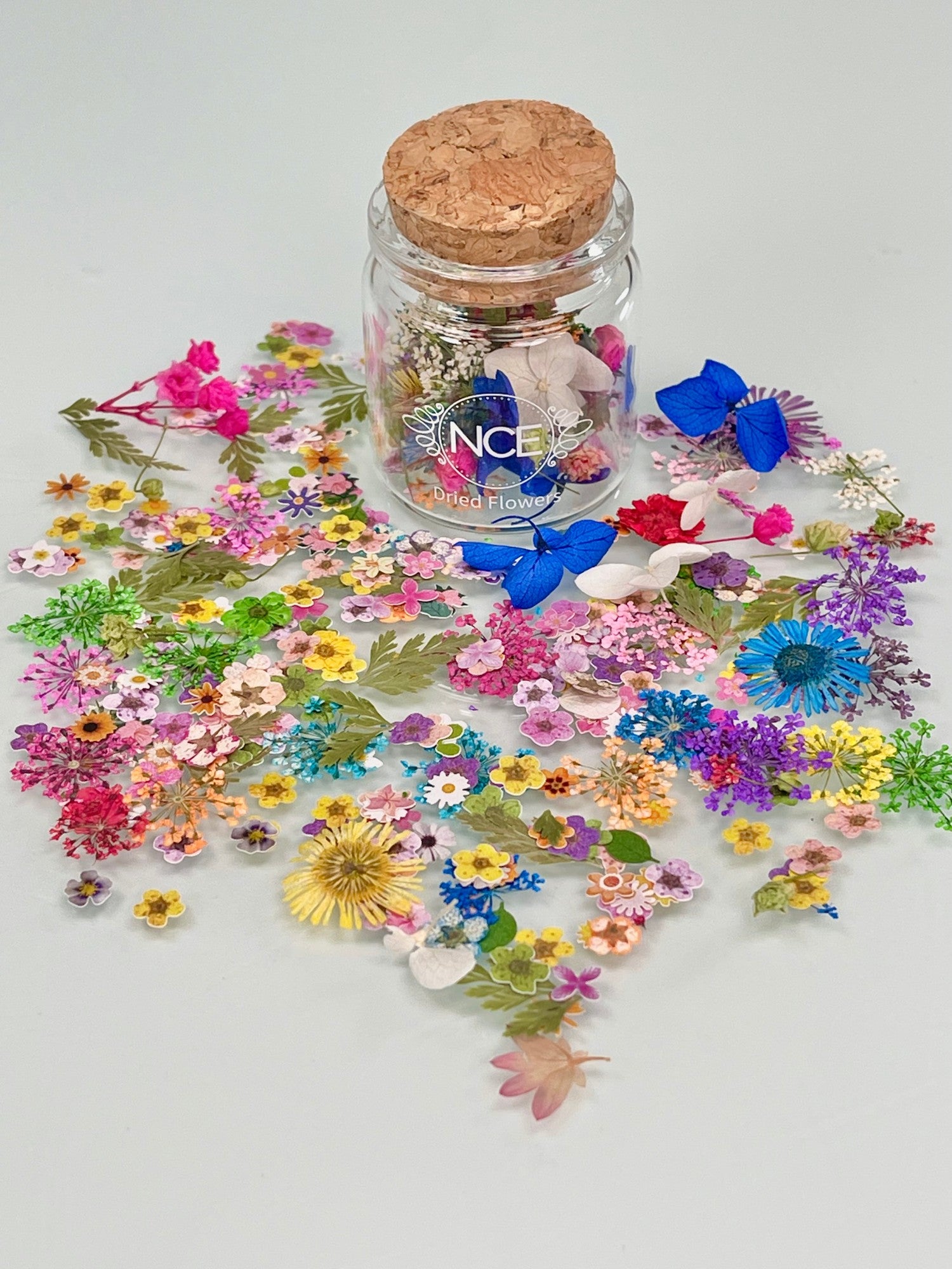 Don’t be fooled by the little glass jar - there’s a lot of flowers in here! 150 real flowers. From big petals to tiny petals, and white and pastel colours to vivid royal blue and bright pink. Ranging in all sizes. Many pieces of leaves included to fill in some foliage. Also includes over 100 paper flowers.