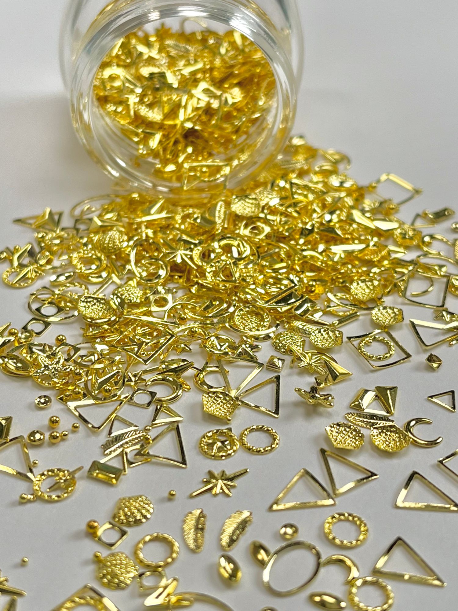 Triangles, squares, circles, feathers, stars, starburst, beads, studs, shells, rectangles, solid triangles, half circles in two sizes, caviar beads, and more