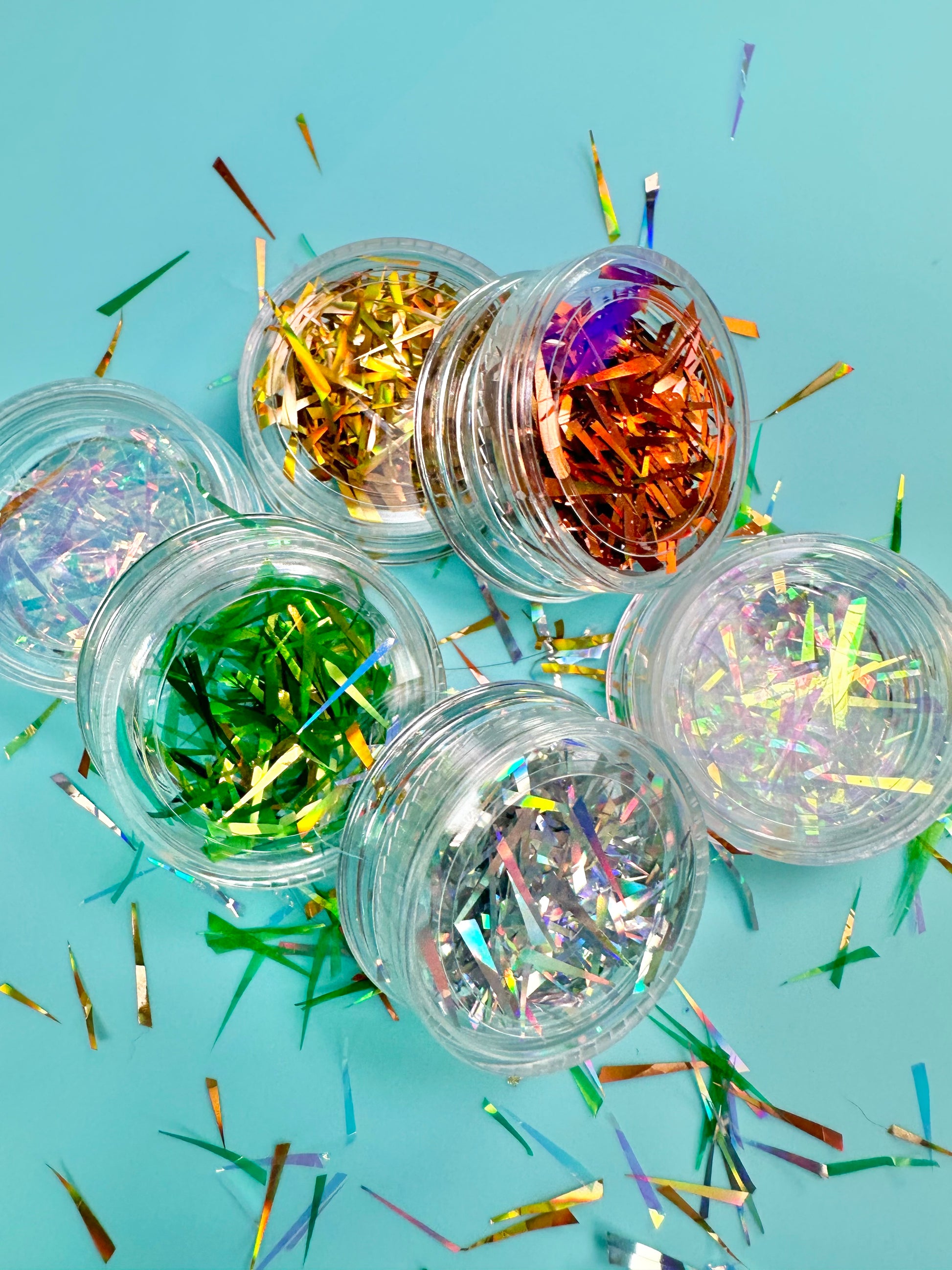 Multi faceted mylar pieces reflect light from all angles. Can be inlayed or placed on top and under Gel Top coats. Inlay with Hard Gels Hybrid Gels and Acrylics.